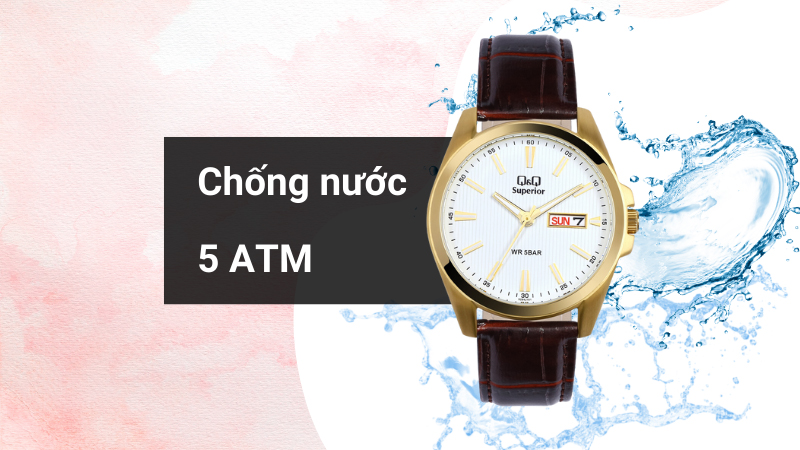 - Hệ số chống nước của đồng hồ nam này 5 ATM nên hoàn toàn thoải mái đeo khi đi tắm, đi mưa và rửa tay. Không nên đeo khi đi bơi hoặc lặn