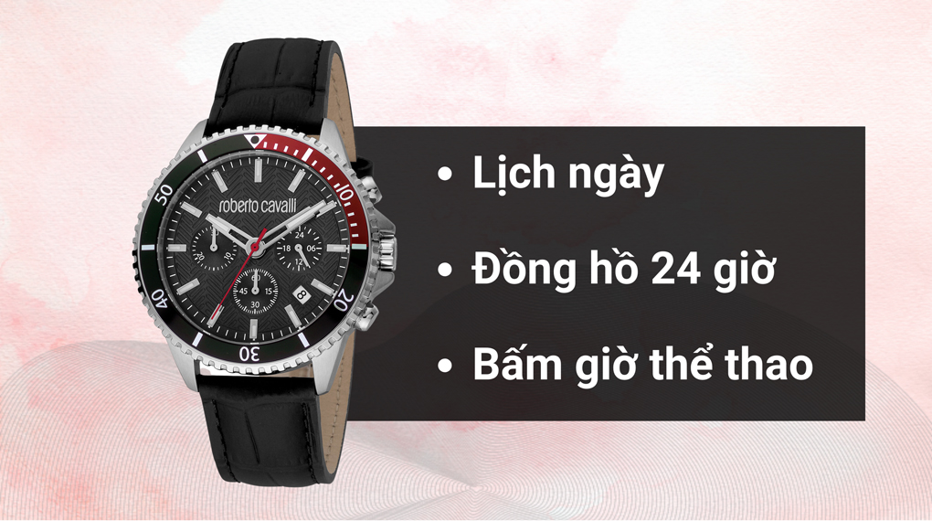 • Đồng hồ Roberto Cavalli này được tích hợp tính năng bấm giờ thể thao cùng nhiều tiện ích khác như lịch ngày và đồng hồ 24 giờ giúp bạn có thể dễ dàng theo dõi thời gian một cách chính xác và thuận tiện.