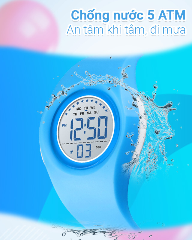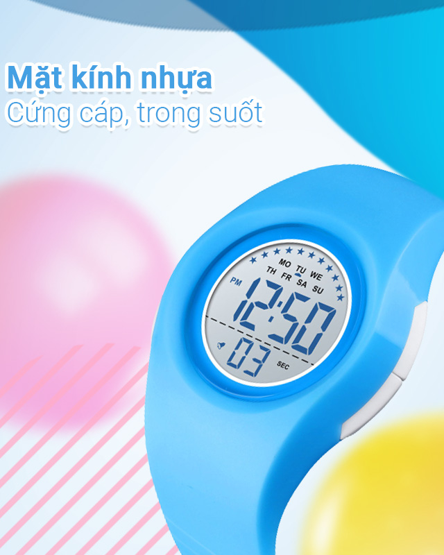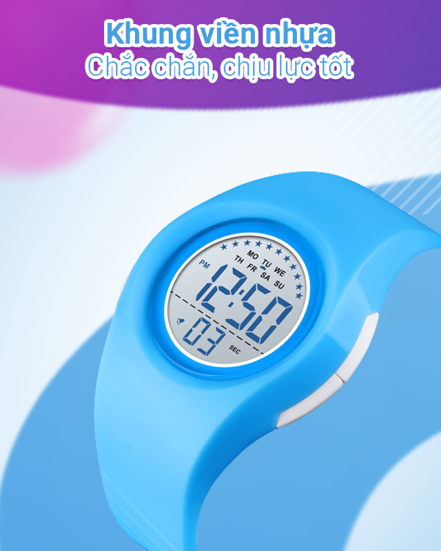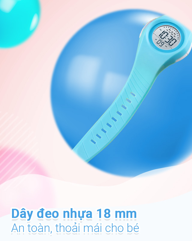 - Khung viền và dây đeo của đồng hồ được làm từ nhựa cho khả năng chống thấm nước tốt, trọng lượng nhẹ, giúp cổ tay bé ít bị mỏi hoặc nặng nề