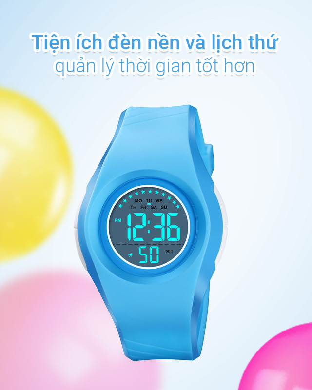 - Mẫu đồng hồ trẻ em này được trang bị tiện ích như lịch thứ, đèn nền hỗ trợ bé xem giờ trong bóng tối