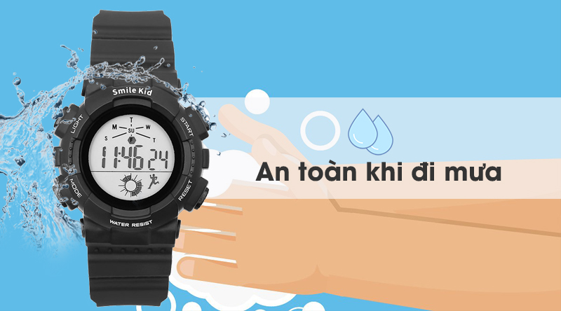Hệ số chống nước 3 ATM, đồng hồ Smile Kid an toàn khi rửa tay hay đi mưa. Không đeo đồng hồ khi đi tắm hay tham gia bơi lội