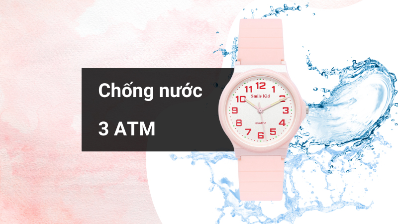 - Chỉ số chống nước 3 ATM: An toàn khi bé đeo đồng hồ đi mưa, rửa tay, không mang khi tắm, bơi, lặn