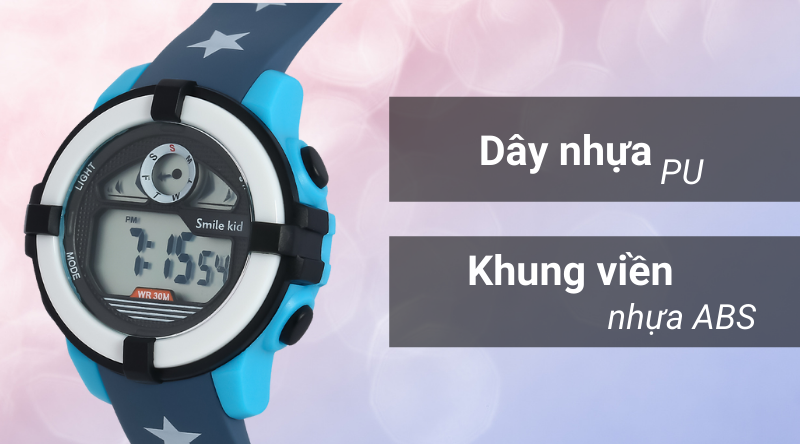 - Đồng hồ Smile Kid được trang bị khung viền làm từ nhựa ABS và dây đeo cũng được làm từ chất liệu nhựa không chỉ đem đến độ bền tối ưu, mà còn mang lại cảm giác thoải mái khi đeo. Mặt kính của đồng hồ được làm từ nhựa PMMA có khả năng chịu lực tốt, khó vỡ.