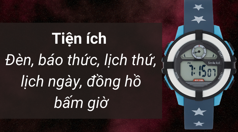 - Mang lại nhiều trải nghiệm tuyệt vời hơn cho trẻ với các tính năng vượt trội như lịch thứ, lịch ngày, báo thức và bấm giờ được trang bị ngay trên mặt đồng hồ vô cùng tiện ích. Bên cạnh đó còn có đèn nền giúp bé có thể quan sát thời gian ngay cả khi trong bóng tối.