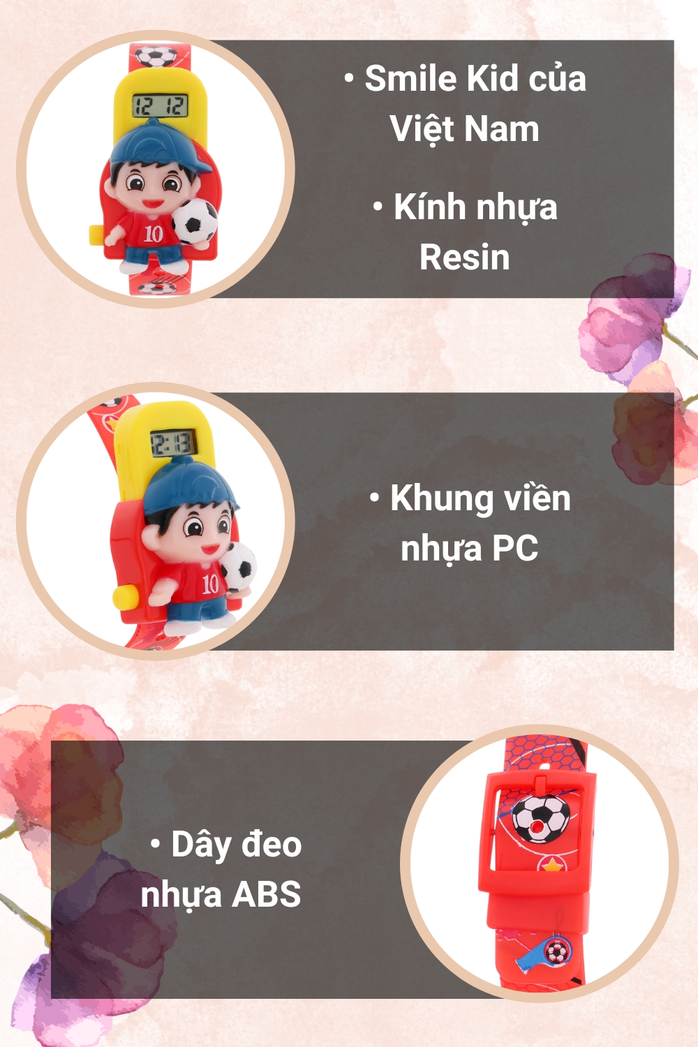 • Khung viền và dây đeo đồng hồ được làm từ nhựa PC và nhựa ABS, mang đến sự nhẹ nhàng, thoải mái cho cổ tay bé. Đồng thời, chất liệu này cũng dễ dàng vệ sinh bằng nước và xà phòng.