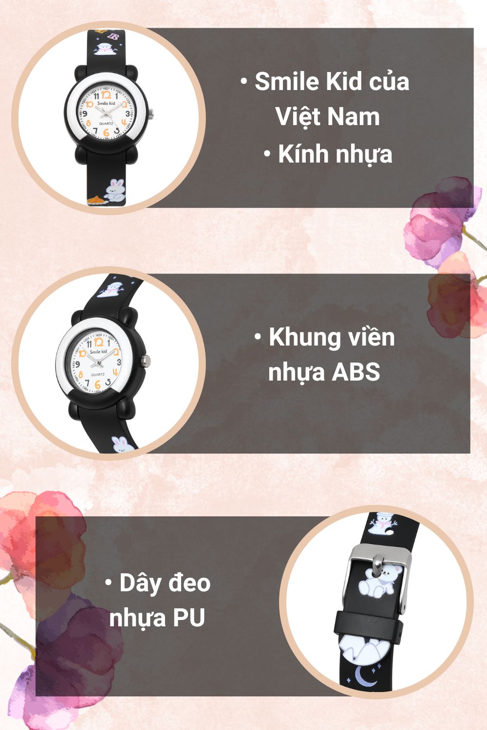 - Đồng hồ Smile Kid với kiểu dáng, mẫu mã năng động, dễ thương phù hợp cho các em nhỏ, đồng thời đồng hồ Smile Kid còn là bạn đồng hành cùng các bé khi đến trường.