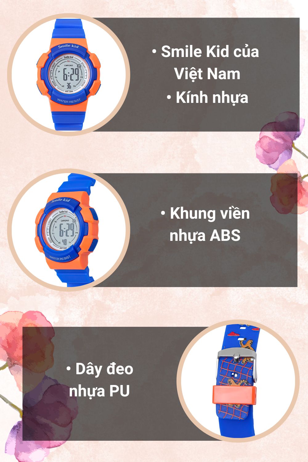 - Đồng hồ Smile Kid với kiểu dáng, mẫu mã năng động, dễ thương phù hợp cho các em nhỏ, đồng thời đồng hồ Smile Kid còn là bạn đồng hành cùng các bé khi đến trường.