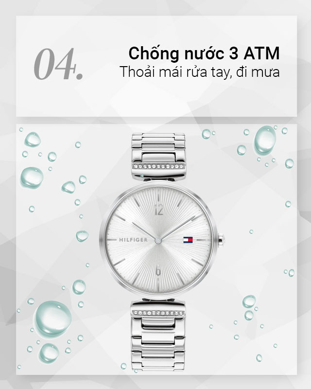 - Hệ số chống nước 3 ATM: Người dùng thoải mái đeo mẫu đồng hồ nữ này khi đi mưa, rửa tay, không mang khi tắm, bơi, lặn