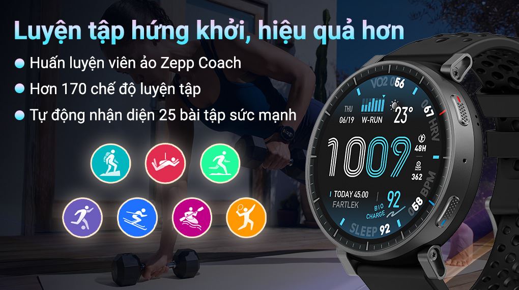 Hướng đến người dùng năng động, đồng hồ thông minh Amazfit hỗ trợ hơn 160 chế độ luyện tập khác nhau. Từ các bộ môn quen thuộc như đi bộ, chạy bộ, đạp xe, bơi lội, yoga cho đến các hình thức tập luyện cường độ cao trong nhà, đồng hồ đều có khả năng theo dõi và ghi nhận dữ liệu đầy đủ.
