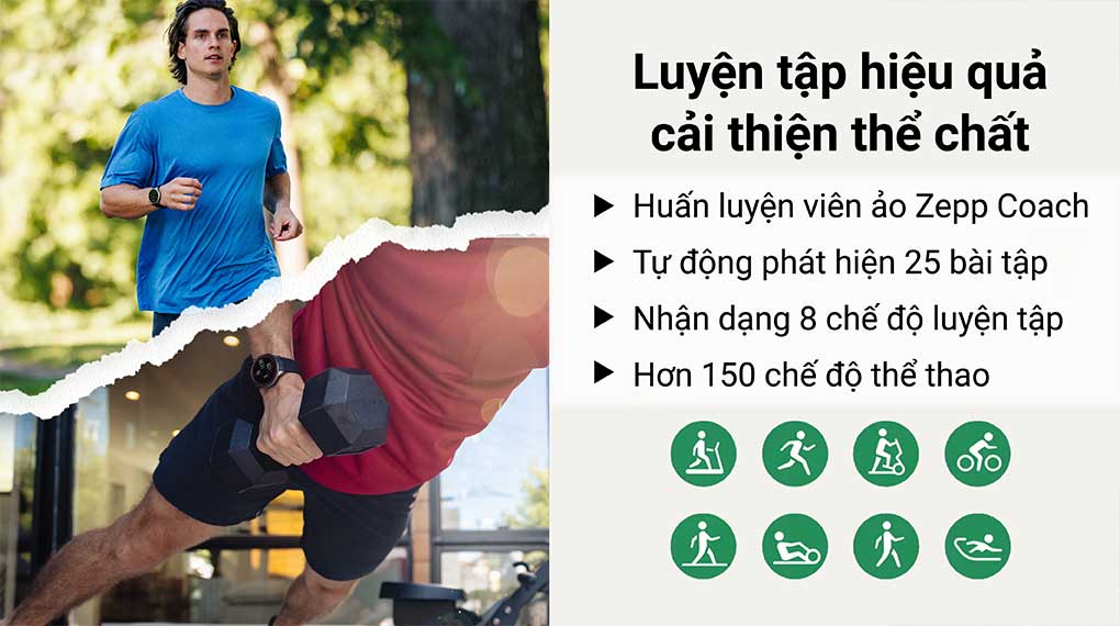 Bên cạnh đó, bạn còn có thể tự tạo bài tập cho 8 môn thể thao phổ biến, bao gồm chạy ngoài trời, đạp xe ngoài trời, đạp xe trong nhà, máy chạy bộ, nhảy dây, thể dục trong nhà, máy chèo thuyền, tập luyện cơ và rèn luyện sức mạnh. Bài tập sẽ được thiết kế trong ứng dụng Zepp theo ý muốn, đáp ứng nhu cầu và mục tiêu cá nhân.