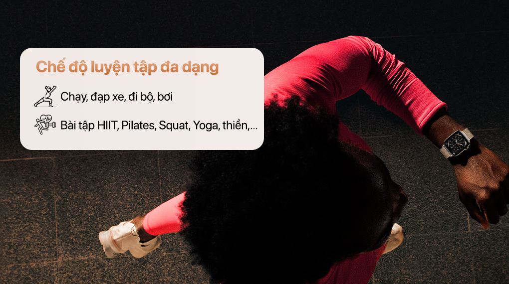 Chiếc đồng hồ thông minh đa tiện ích này là một trợ lý sức khỏe toàn diện giúp bạn đạt được mọi mục tiêu tập luyện. Từ yoga dẻo dai, pilates bền bỉ cho đến những bài chạy hay đạp xe cường độ cao, Apple Watch đều theo dõi chi tiết và cung cấp dữ liệu trực quan. Đặc biệt, khả năng tùy chỉnh bài tập theo thể trạng giúp mỗi buổi tập trở nên thú vị hơn, tạo động lực để bạn duy trì thói quen lành mạnh.
