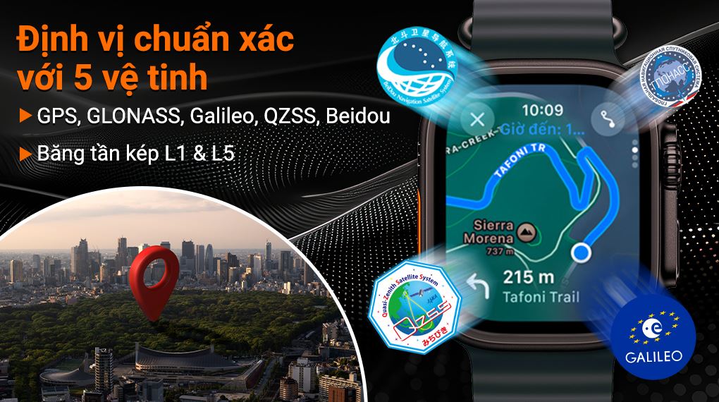 Phiên bản Apple Watch này còn cho nổi bật với các công nghệ định vị chính xác như băng tần kép (L1 và L5), kết hợp cùng hệ thống vệ tinh toàn cầu như Galileo, Beidou, GLONASS, GPS và QZSS. Dù bạn đang ở khu vực đông đúc hay vùng núi có nhiều vật cản, thiết bị vẫn đảm bảo việc định vị diễn ra mượt mà và chính xác. Đảm bảo an toàn cho những ai đam mê phiêu lưu và khám phá.