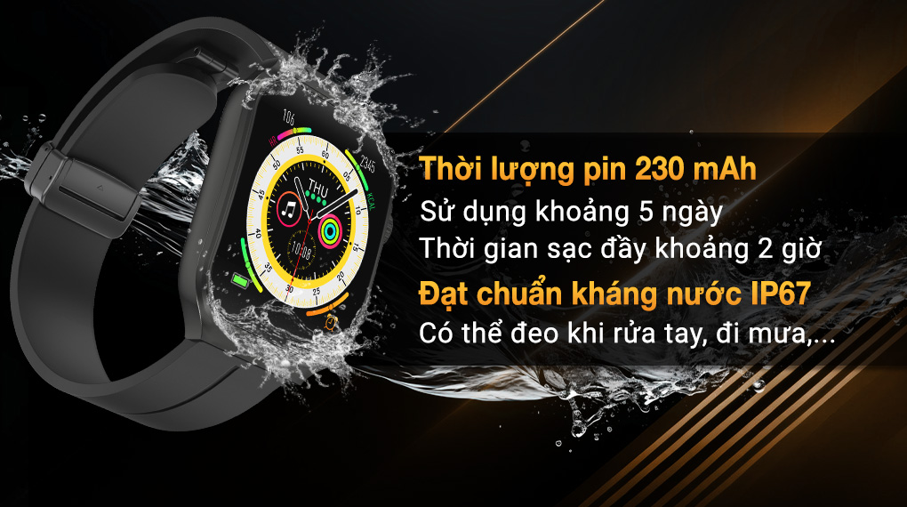 Chiếc đồng hồ thông minh được trang bị viên pin 230 mAh có thời lượng pin ấn tượng lên tới 5 ngày. Điều này giúp người dùng có thể sử dụng đồng hồ thoải mái trong các hoạt động hằng ngày, từ theo dõi sức khỏe, tập luyện thể thao, đến nhận thông báo,... mà không phải lo lắng về vấn đề hết pin. Thời gian sạc pin cũng khá nhanh chỉ khoảng 2 giờ thông qua sạc nam châm.