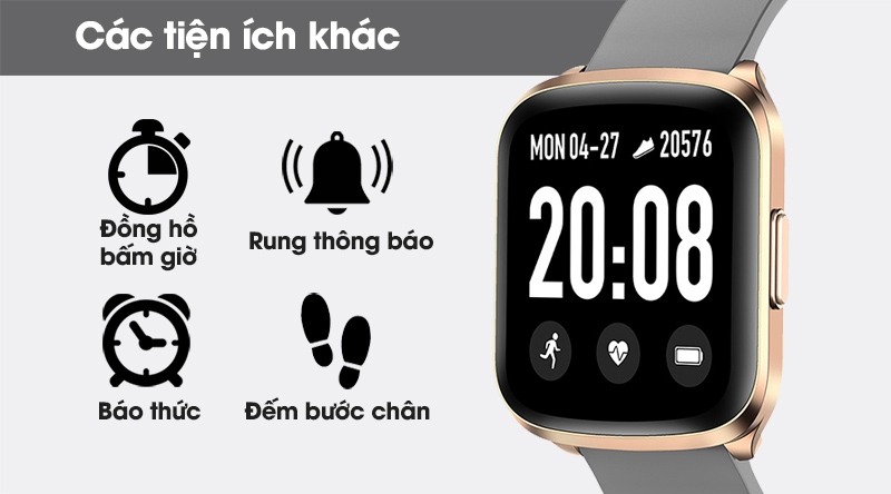 Gồm các tính năng như: La bàn, rung thông báo, báo thức, đếm bước chân, bấm giờ thể thao,....