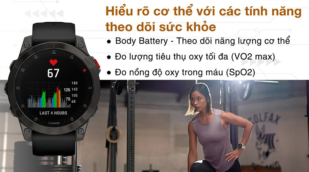 Đồng hồ thông minh Garmin Epix với các tính năng sức khỏe như: Lượng oxy tiêu thụ tối đa, theo dõi mức độ stress, theo dõi nhịp thở, đo nồng độ oxy trong máu (SpO2), đo năng lượng cơ thể, theo dõi giấc ngủ, chu kỳ kinh nguyệt,... người dùng có thể biết sơ lược về tình trạng sức khỏe một cách nhanh chóng ở bất kỳ đâu.
