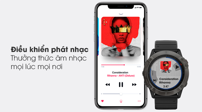 Garmin Fenix 6X sau khi kết nối với điện thoại có thể điều khiển phát nhạc từ xa, người dùng có thể tùy chỉnh tăng giảm âm lượng ngay trên cổ tay, phát bài hát yêu thích.