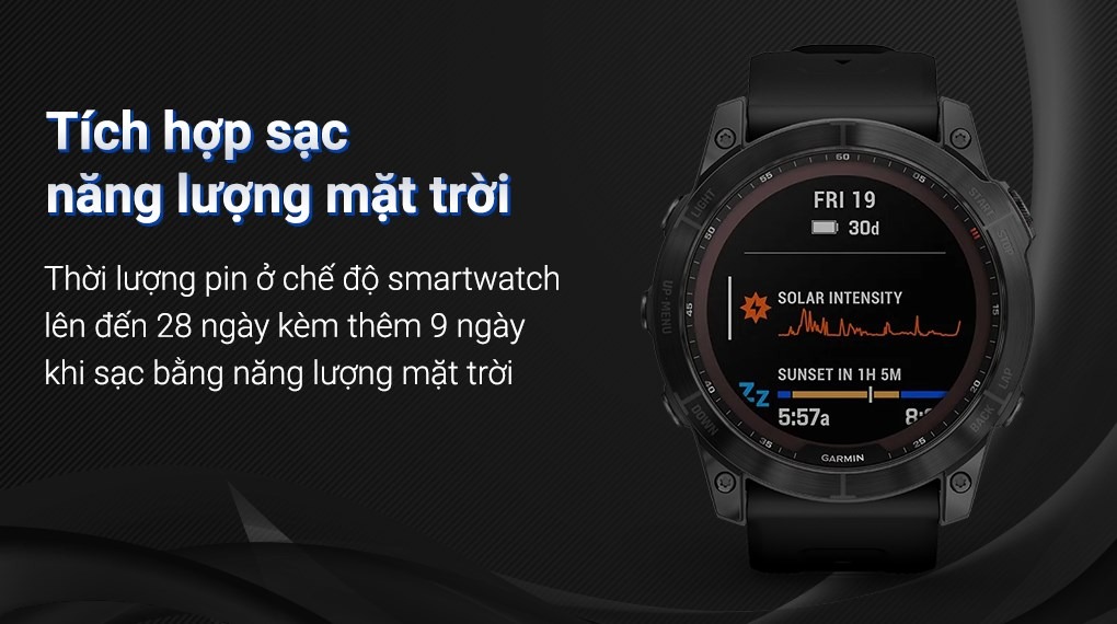 Garmin Fenix 7X Solar Titanium có hỗ trợ nạp pin bằng năng lượng mặt trời vô cùng thân thiện với môi trường. Phương thức sạc này giúp thiết bị nạp thêm năng lượng một cách dễ dàng, chỉ cần tiếp xúc với ánh sáng mặt trời.