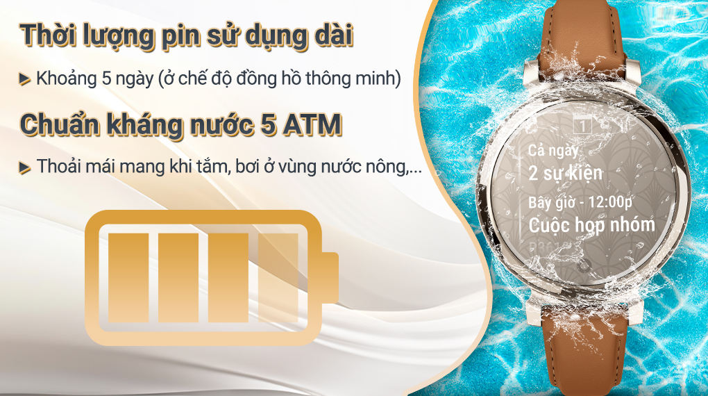 Đạt chuẩn kháng nước 5 ATM, Garmin Lily 2 Classic cho phép bạn thoải mái đeo khi rửa tay, đi mưa, tắm, bơi lội ở vùng nước nông,... trở thành người bạn đồng hành đáng tin cậy trong mọi hành trình. Để đảm bảo tuổi thọ và hiệu suất cho đồng hồ, bạn nên tránh sử dụng trong môi trường khắc nghiệt như phòng xông hơi, suối nước nóng hoặc ngâm trong hóa chất.