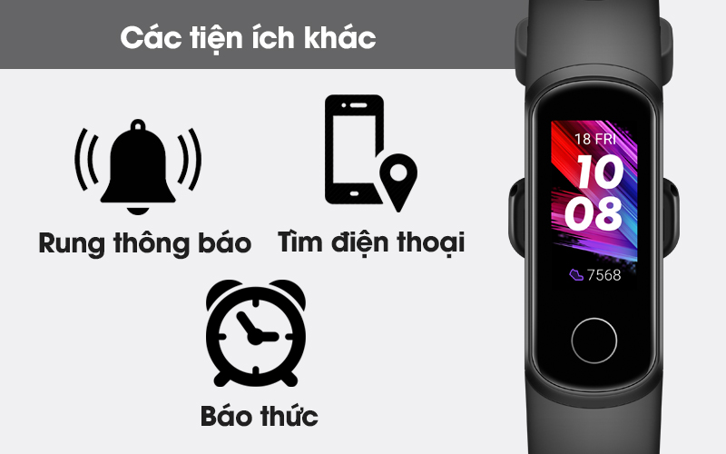 Bao gồm nhiều tiện ích khác như tìm điện thoại, thông báo rung, báo thức, bấm giờ tập luyện,... Bạn có thể điều khiển phát nhạc thông qua Honor Band 5i, chuyển bài hát và điều chỉnh âm lượng theo ý muốn.