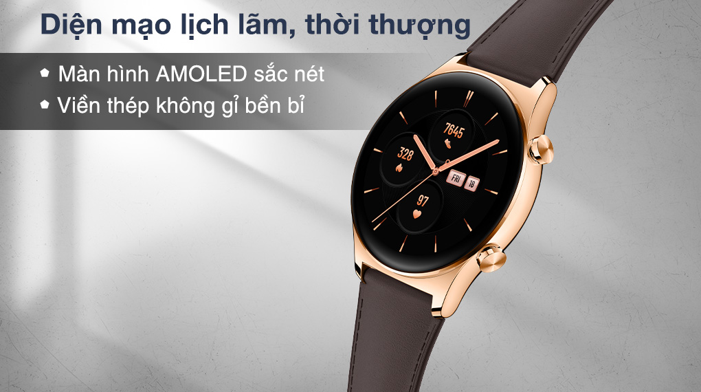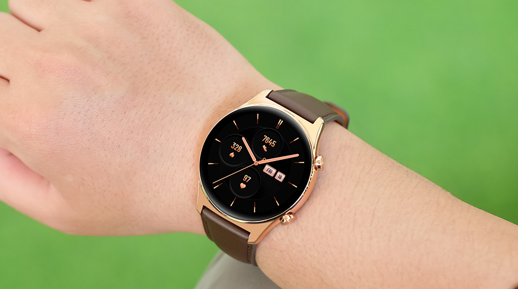 HONOR Watch GS3 kế thừa phong cách thiết kế của các thế hệ trước, mặt đồng hồ hình tròn tạo sự gọn gàng khi đeo trên tay. Khối lượng 44 g khá nhẹ không ảnh hưởng đến hoạt động tay của người dùng, đeo liên tục cả ngày cũng không mỏi. Ngay cạnh bên phải của mặt đồng hồ được trang bị hai nút vật lý hỗ trợ truy cập nhanh các ứng dụng.