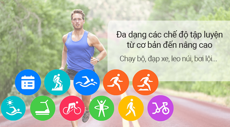 Đồng hồ đeo tay hỗ trợ nhiều hoạt động ngoài trời và trong nhà, bao gồm: leo núi, bơi lội, v.v ... Kết hợp với chế độ luyện tập 11 bài tập cơ bản. Đồng hồ đeo tay luôn sẵn sàng đồng hành cùng bạn!