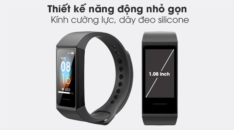 Màn hình của Mi Band 4c có kích thước 1.08 inch và độ phân giải 128 x 220 pixels giúp hình ảnh và thông tin được hiển thị đầy đủ và sắc nét. Dây đeo silicone tạo cảm giác được thoải mái dù đeo vòng tay trong thời gian dài, hợp thời trang và hoàn toàn không hề bị bay màu khi sử dụng lâu dài.