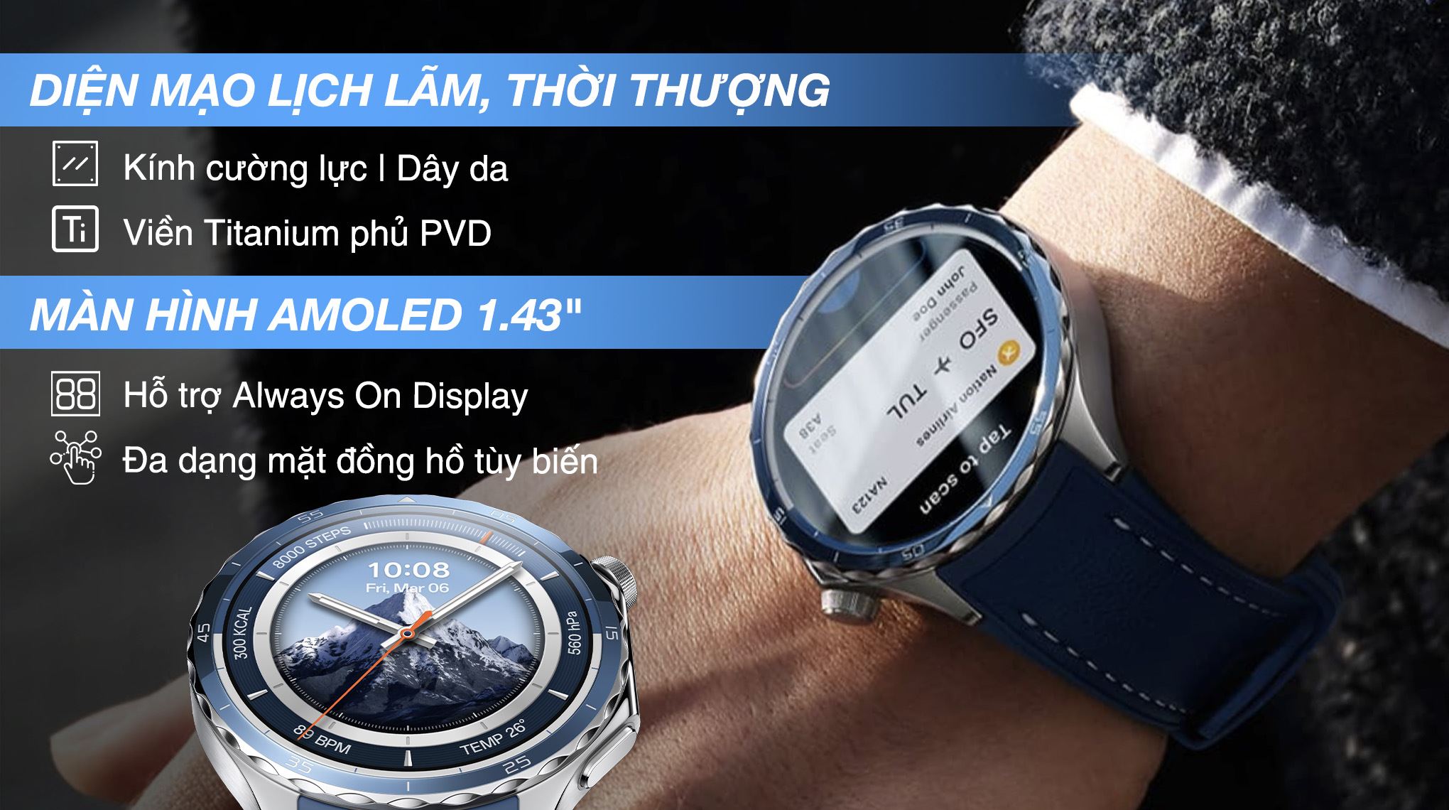 Đồng hồ thông minh Oppo gây ấn tượng ngay từ cái nhìn đầu tiên với thiết kế mặt tròn cổ điển, gợi nhớ đến những mẫu đồng hồ cơ thời thượng. Khung viền được chế tác từ Titanium phủ lớp PVD cao cấp không chỉ giúp chống xước, chống ăn mòn mà còn tạo nên vẻ ngoài vững chắc và tinh tế. Dây da mềm mại, ôm gọn cổ tay mang lại cảm giác đeo thoải mái cả ngày, thích hợp trong môi trường công sở nghiêm túc lẫn những buổi tiệc trang trọng.