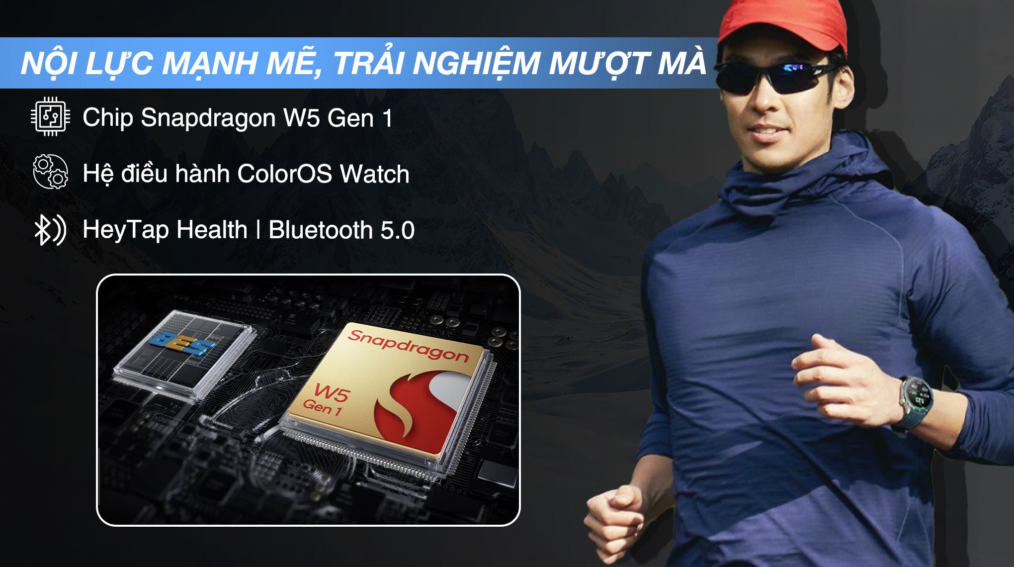 Sự mượt mà trong mọi thao tác của đồng hồ thông minh đến từ vi xử lý Snapdragon W5 Gen 1 - một trong những con chip mạnh mẽ nhất dành cho smartwatch hiện nay. Kết hợp với hệ điều hành ColorOS Watch được tùy biến riêng cho thiết bị đeo, người dùng sẽ có trải nghiệm liền mạch khi truy cập các tính năng, giao tiếp, điều khiển thiết bị hoặc luyện tập.