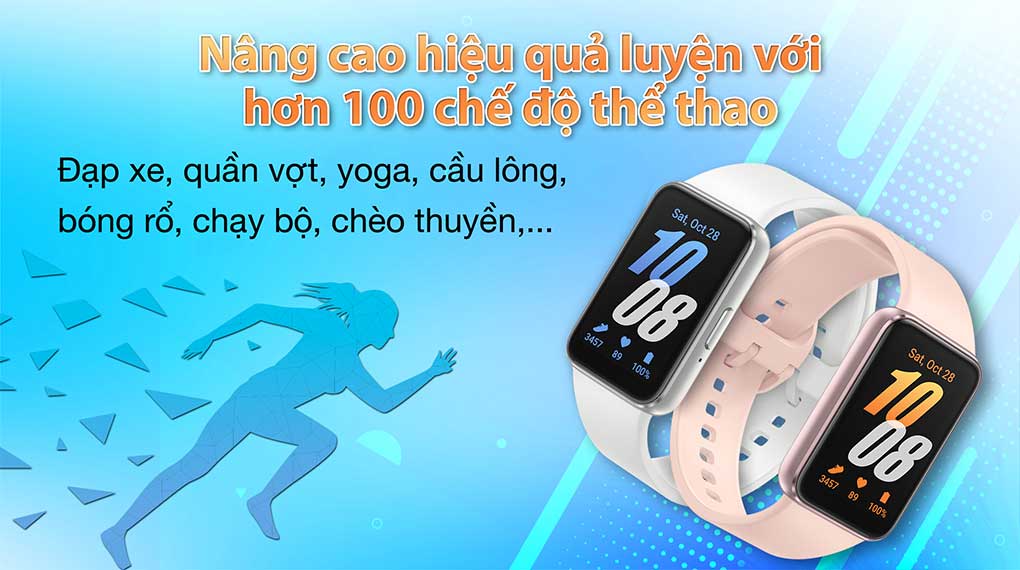 Với hơn 100 chế độ thể thao đa dạng, từ các hoạt động cơ bản như đi bộ, chạy bộ, đạp xe đến các bài tập chuyên sâu như bơi lội, leo núi,... chiếc vòng tay thông minh Samsung này sẽ hỗ trợ bạn tập luyện hiệu quả ở mọi lúc mọi nơi. Thiết bị còn có thể ghi nhận các chỉ số quan trọng như nhịp tim, số bước chân, lượng calo tiêu thụ,... giúp bạn theo dõi tiến độ tập luyện và điều chỉnh kế hoạch phù hợp.