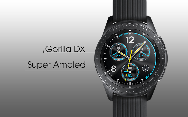 Màn hình trên Samsung Galaxy Watch sẽ hạn chế trầy xước với mặt kính Gorilla DX+ được trang bị, kết hợp tấm nền Super AMOLED cho mọi thông tin hiển thị sắc nét, chi tiết hơn.