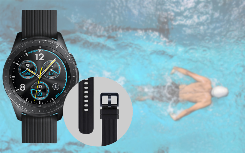 Dây đeo của Galaxy Watch được sử dụng chất liệu cao su hỗ trợ hạn chế tối đa việc bong tróc khi dây tiếp xúc với nước hoặc mồ hôi khi vận động trong thời gian dài.