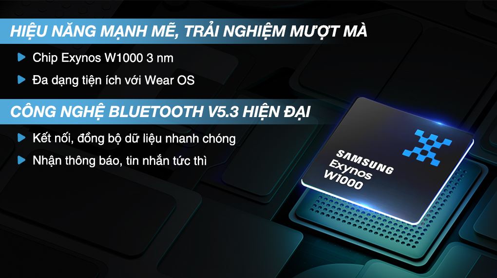 Trung tâm điều khiển của đồng hồ thông minh Samsung là con chip Exynos W1000 sản xuất trên tiến trình 3 nm. Đây là bước tiến lớn về công nghệ, giúp thiết bị đạt được hiệu suất xử lý mạnh mẽ hơn, trong khi mức tiêu thụ năng lượng giảm đáng kể.