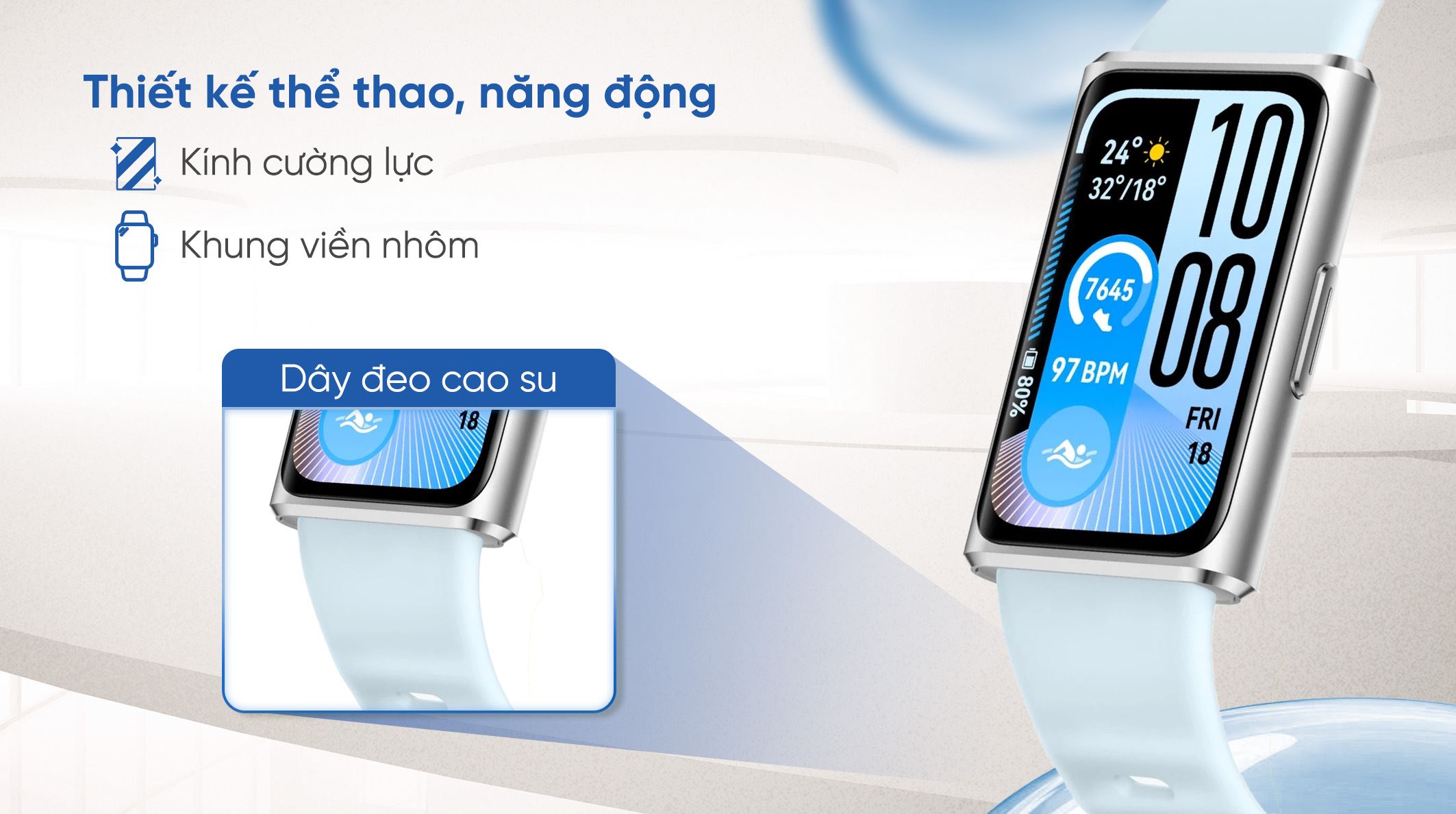Vòng đeo tay thông minh nhà Huawei sở hữu thiết kế mặt chữ nhật bo cong mềm mại, tạo cảm giác hiện đại và phù hợp với nhiều phong cách khác nhau. Phần thân máy được hoàn thiện chắc chắn, kết hợp cùng dây cao su cao cấp mang lại tổng thể hài hòa giữa độ bền và sự tinh tế.