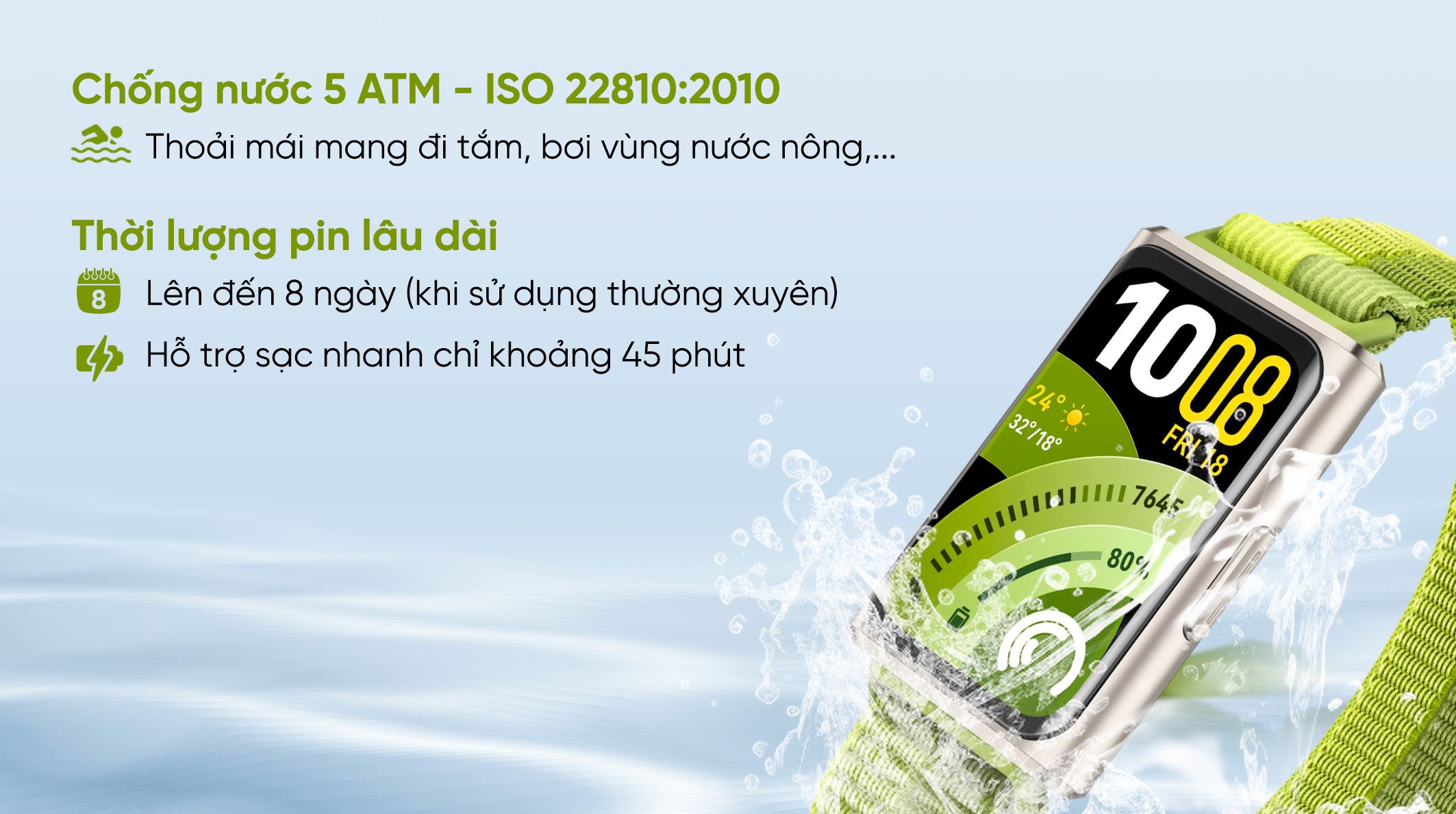 Chuẩn kháng nước 5 ATM giúp bạn yên tâm sử dụng khi rửa tay, đi mưa hoặc bơi ở vùng nước nông. Tuy nhiên, để đảm bảo độ bền lâu dài, nên hạn chế tiếp xúc với nước nóng hoặc môi trường hóa chất mạnh.