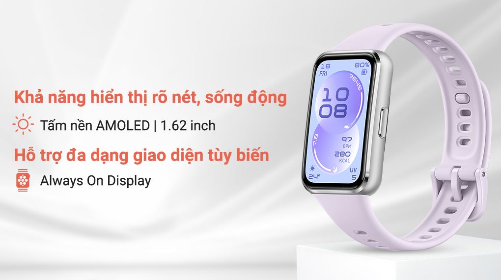 Vòng đeo tay thông minh Huawei sở hữu màn hình AMOLED kích thước 1.62 inch với độ phân giải 286 x 482 pixels, mang lại không gian hiển thị rộng rãi và chi tiết rõ ràng. Các thông tin như thời gian, thông báo, dữ liệu vận động hay chỉ số sức khỏe đều được thể hiện trực quan, màu sắc rực rỡ và độ tương phản cao.
