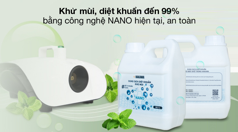 Chuyên dùng cho thiết bị máy diệt khuẩn khử mùi công nghệ NANO HK-2020 KT, được khuếch tán ra ngoài không khí dưới dạng hạt Nano siêu mịn đến khắp các ngõ ngách để bám lấy vi khuẩn, đóng băng và làm mất khả năng hoạt động của chúng.