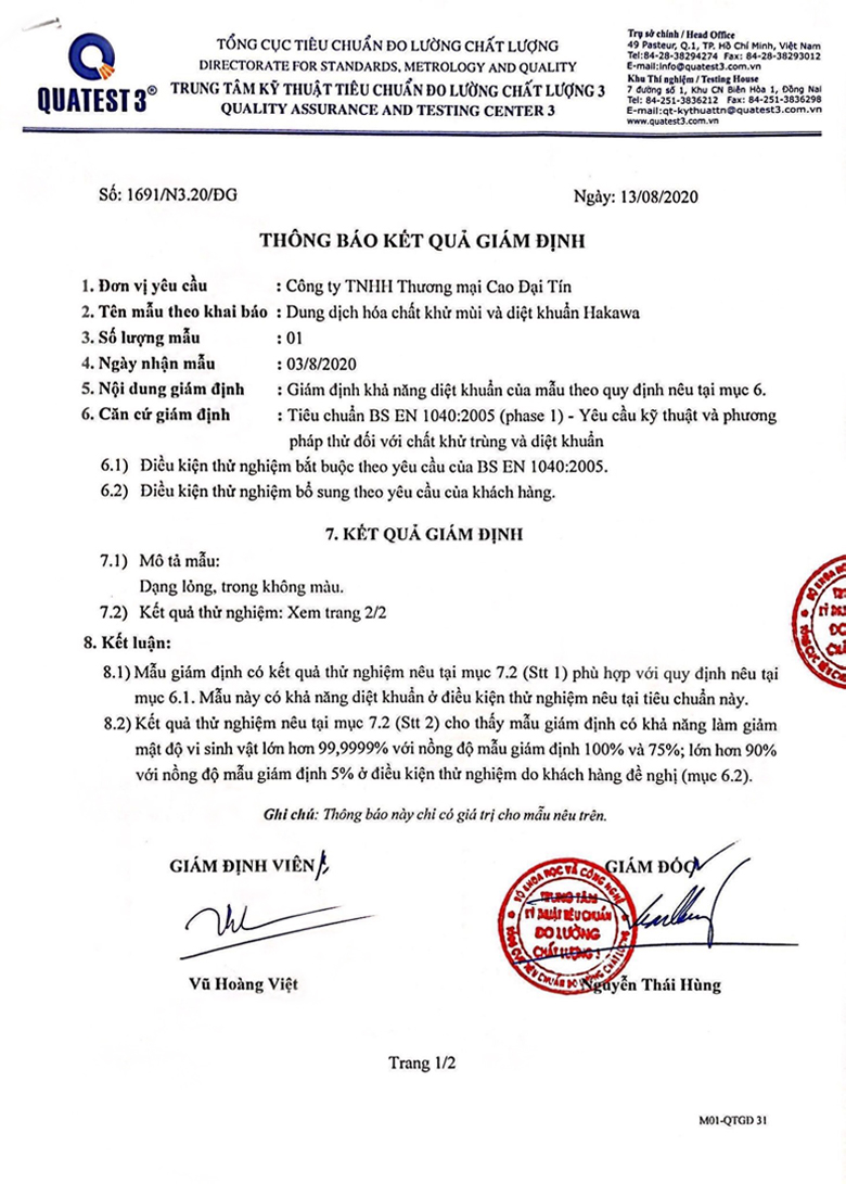 Dung dịch khử mùi diệt khuẩn 1 lít HAKAWA DD-2020KT - Giấy chứng nhận