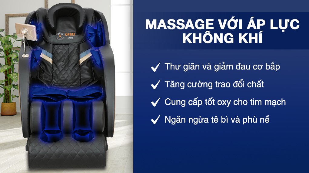 Chức năng massage áp lực không khí được thực hiện thông qua hệ thống túi khí ở: bàn chân, bắp chân, vai, hông, tay, đầu theo cơ chế xả nến khí. Giúp xoa dịu những cơn đau cơ bắp, tăng cường quá trình trao đổi chất, hạn chế chứng tê bì tay chân và phù nề, cung cấp oxy cho tim mạch tốt hơn.