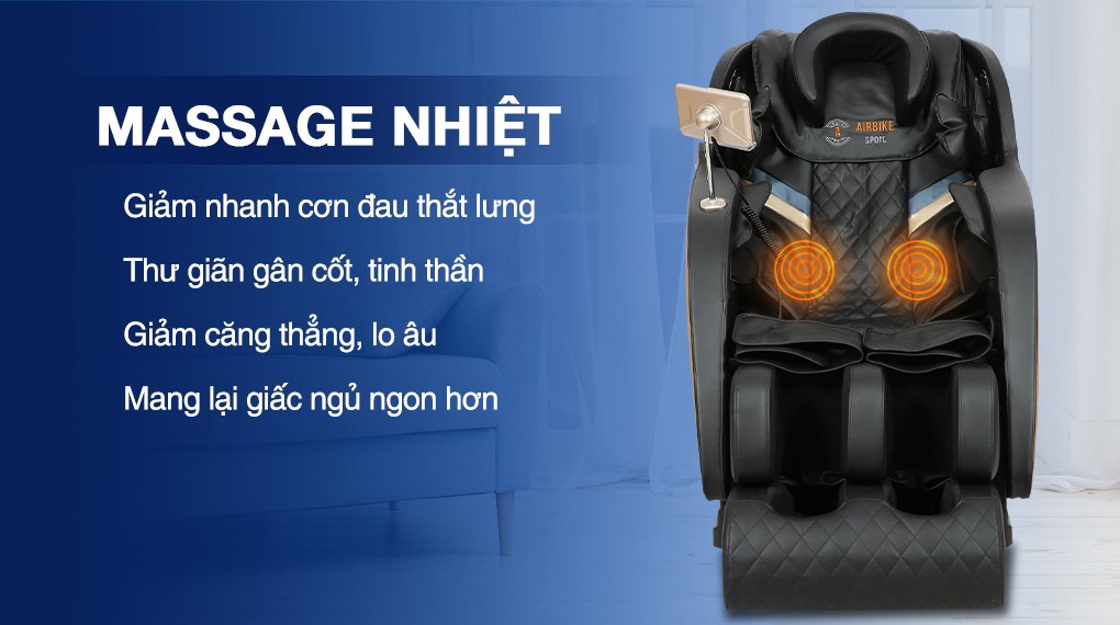Massage nhiệt hồng ngoại là phương pháp thường được sử dụng để điều trị các vấn đề liên quan đến xương khớp như: đau mỏi vai gáy, thoát vị đĩa đệm, thoái hóa cột sống,... Chính vì vậy mà chế độ massage nhiệt thông qua sợi carbon của ghế massage Airbike Sport MK-336 có thể giúp bạn thư giãn gân cốt, làm ấm cơ thể từ đó giảm nhanh cơn đau lưng hiệu quả, đặc biệt khi thời tiết bắt đầu lạnh. Không chỉ vậy, chức năng này còn hỗ trợ lưu thông khí huyết được tốt hơn, giảm tình trạng căng thẳng, lo âu ở người lớn tuổi.