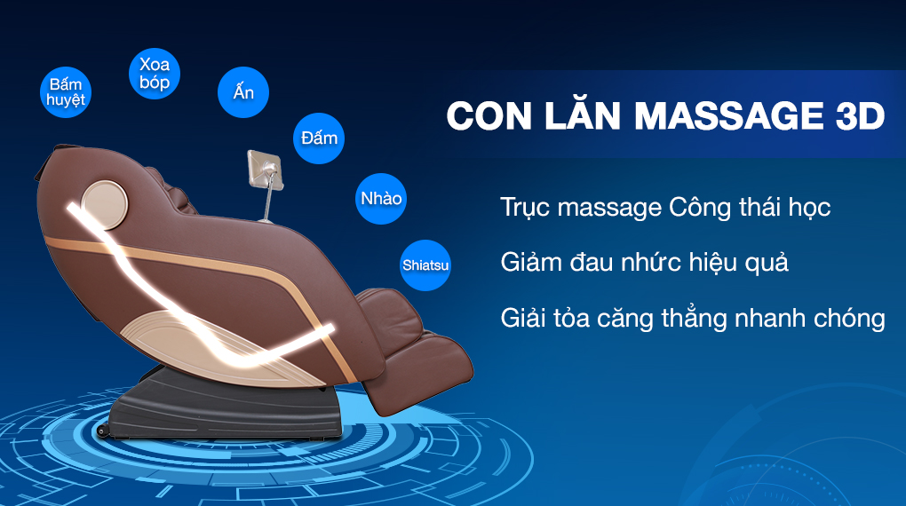 - Hệ thống con lăn massage 3D kết hợp công nghệ Scan Body giúp massage chính xác các huyệt đạo trên cơ thể, giúp xua tan cơn đau nhức một cách nhanh chóng.