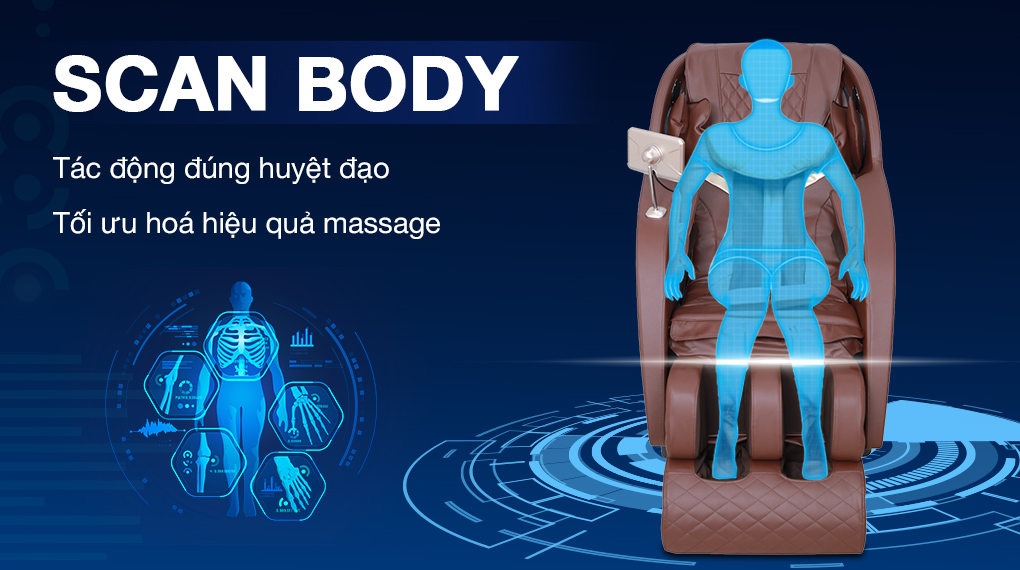 Chức năng Scan Body có khả năng quét và đo lường cơ thể để điều chỉnh ghế, giúp cho các con lăn có thể tác động đúng huyệt đạo, từ đó làm dịu các cơn đau mỏi toàn thân, tối ưu hoá hiệu quả massage.