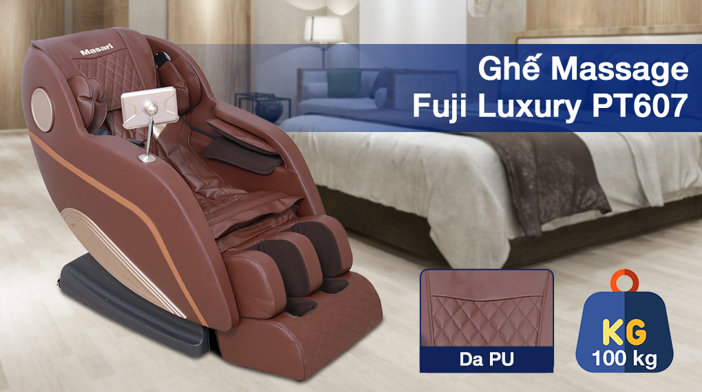 Ghế massage Fuji Luxury PT607 có thiết kế hài hoà với chất liệu da PU mềm mại, sử dụng khung sườn bằng hợp kim chắc chắn nên có thể chịu được trọng tải đến 100 kg. Mẫu ghế massage này có thể quét được toàn bộ cơ thể, để điều chỉnh ghế phù hợp, đồng thời kết hợp với hệ thống con lăn 3D và hệ thống 20 túi khí được bố trí chuẩn xác, làm giảm cơn đau nhức hiệu quả.