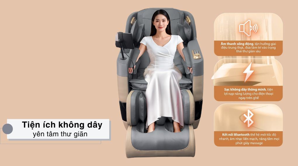 Ngoài ra sản phẩm có trang bị cổng kết nối Bluetooth, giúp phát nhạc thư giãn trực tiếp từ điện thoại hoặc thiết bị thông minh. Tích hợp sạc điện thoại không dây, thuận tiện cho việc nạp pin thiết bị trong lúc nghỉ ngơi.