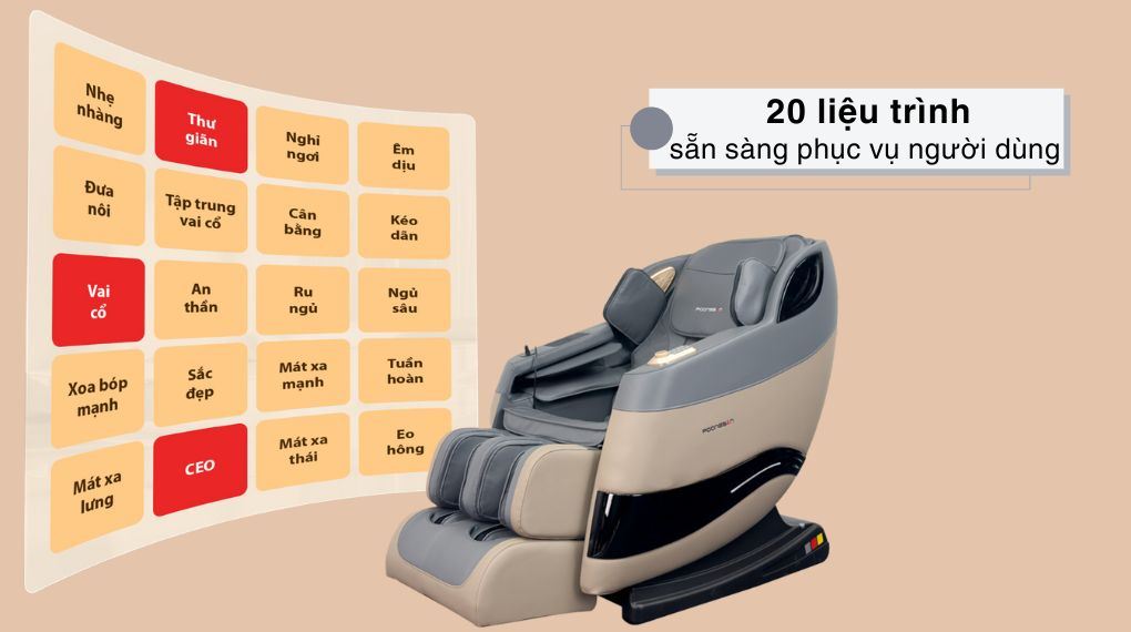 Thư viện liệu trình 20 chương trình trên ghế massage được thiết kế đa dạng, đáp ứng nhiều nhu cầu sử dụng khác nhau như thư giãn nhẹ nhàng, phục hồi cơ thể, massage toàn thân hoặc tập trung từng vùng.