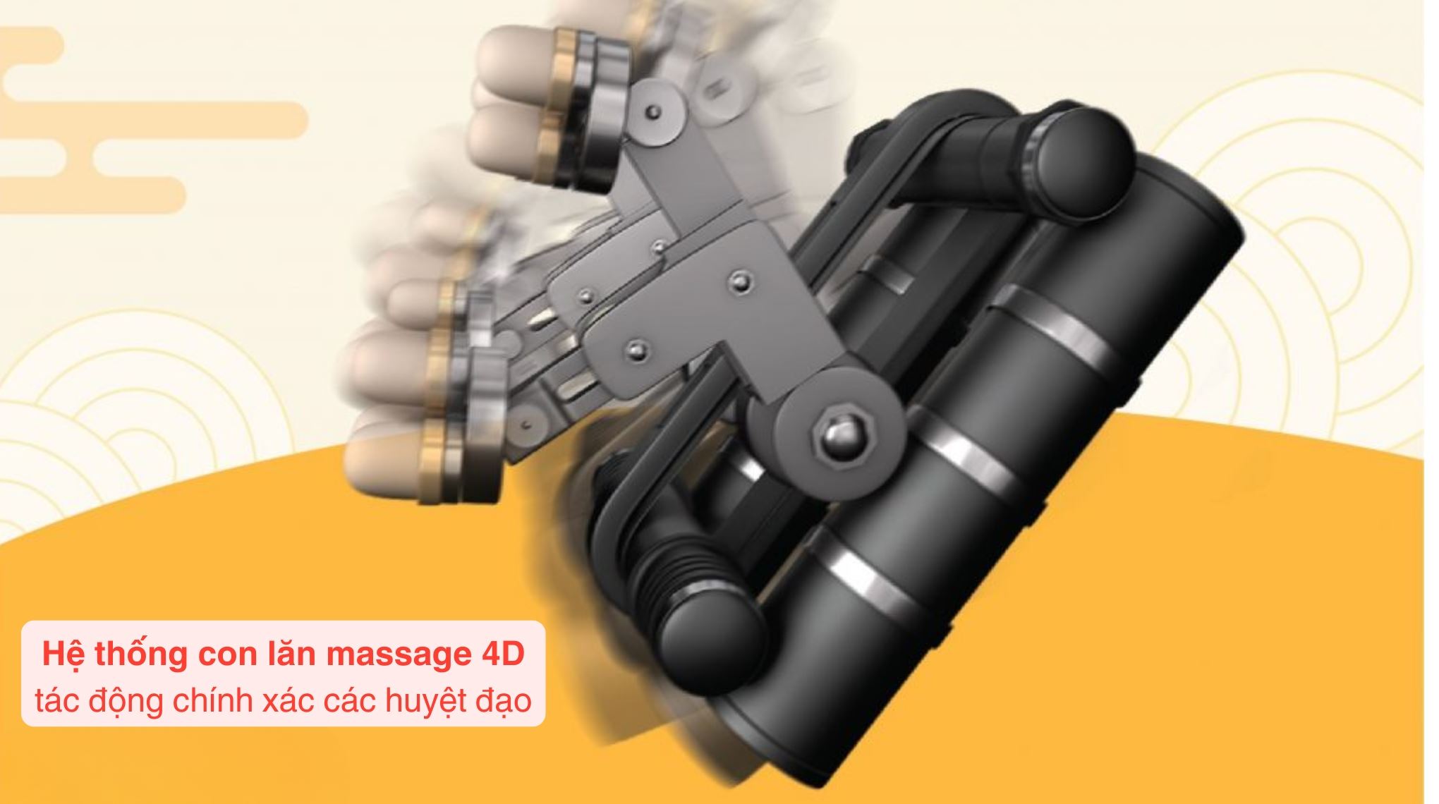 Ghế massage được trang bị trục SL đi theo đường cong cột sống từ vùng cổ xuống đến khu vực mông, giúp con lăn tiếp xúc sát với lưng và eo. Hệ thống con lăn massage 4D di chuyển linh hoạt, thay đổi hướng, biên độ và tốc độ để thực hiện các kỹ thuật xoa bóp, nhào, vỗ, day miết, xoa bóp kết hợp vỗ nhẹ.