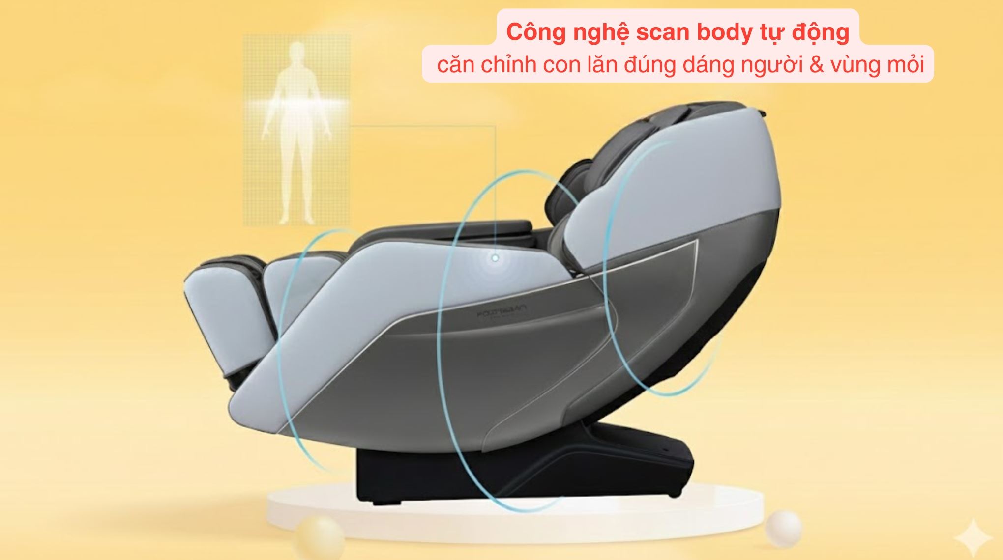 Trước khi bắt đầu, máy thực hiện scan body để nhận diện chiều cao và hình dạng lưng từng người, từ đó canh chỉnh vị trí con lăn phù hợp hơn với vùng cổ, vai, lưng và thắt lưng. Công suất 150W đảm bảo lực tác động đủ mạnh để hỗ trợ giảm căng mỏi cơ sau khi ngồi lâu hoặc vận động.