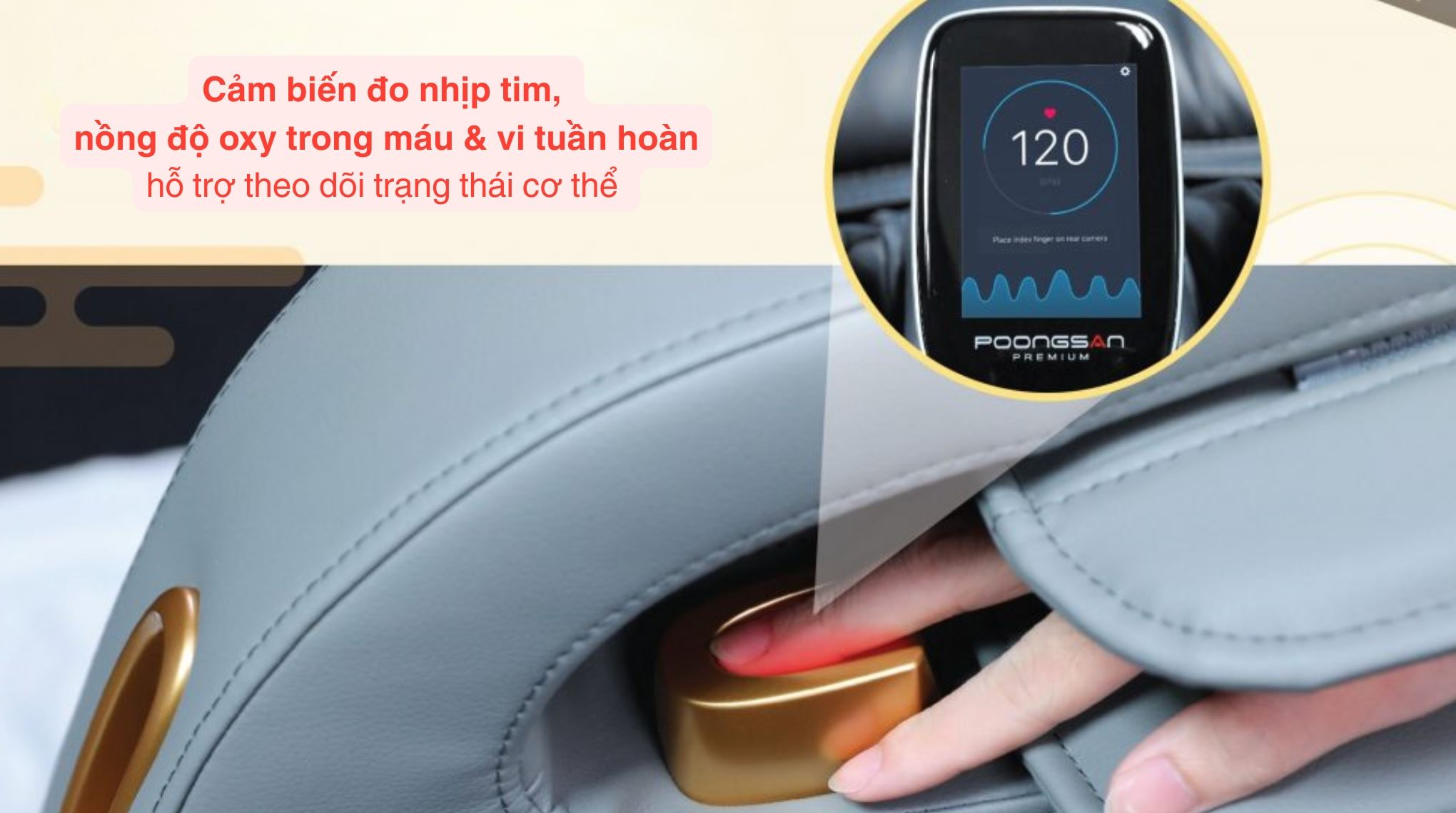 Poongsan MCP-804-GR tích hợp các cảm biến hỗ trợ đo nhịp tim, nồng độ oxy trong máu và vi tuần hoàn, giúp người dùng theo dõi trạng thái cơ thể trong lúc thư giãn.