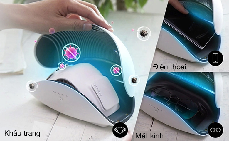 Bên cạnh việc sử dụng để cất giữ khẩu trang, bạn cũng có thể sử dụng hộp đựng khẩu trang lọc không khí LG để loại bỏ vi khuẩn trên đồ dùng được cất trong hộp như điện thoại di động (iphone 11, iphone 12, Samsung note 10,...) hay mắt kính,...