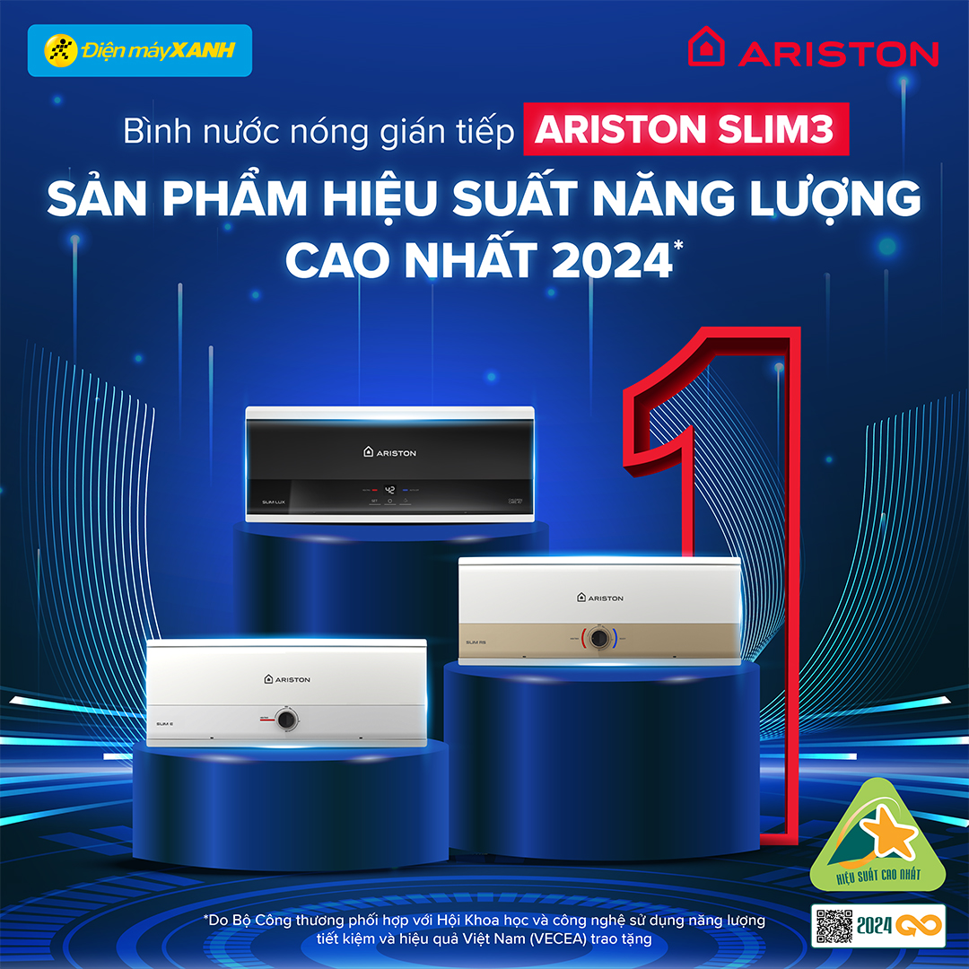 Năm 2024, Ariston vinh dự là 1 trong số 12 doanh nghiệp nhận cúp Người dẫn đầu, đồng thời dòng sản phẩm bình nước nóng gián tiếp Slim3 từ thương hiệu cũng được công nhận là sản phẩm Hiệu suất năng lượng cao nhất 2024 tại Giải thưởng “Sản phẩm Hiệu suất năng lượng cao nhất” do Bộ Công Thương và Hội Khoa học và công nghệ sử dụng năng lượng tiết kiệm và hiệu quả Việt Nam (VECEA) tổ chức.