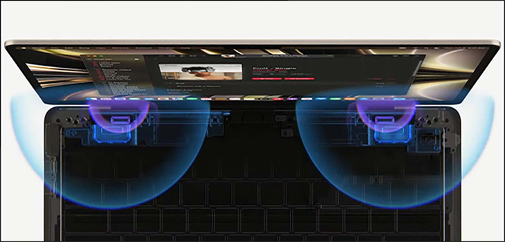 Với sự cải tiến thiết kế loa của MacBook Air M2 hỗ trợ chất lượng âm như âm thanh không gian, giúp cho việc nghe nhạc, xem phim cũng trở nên sống động hơn, đem lại một sự trải nghiệm âm nhạc tuyệt vời hơn bao giờ hết.